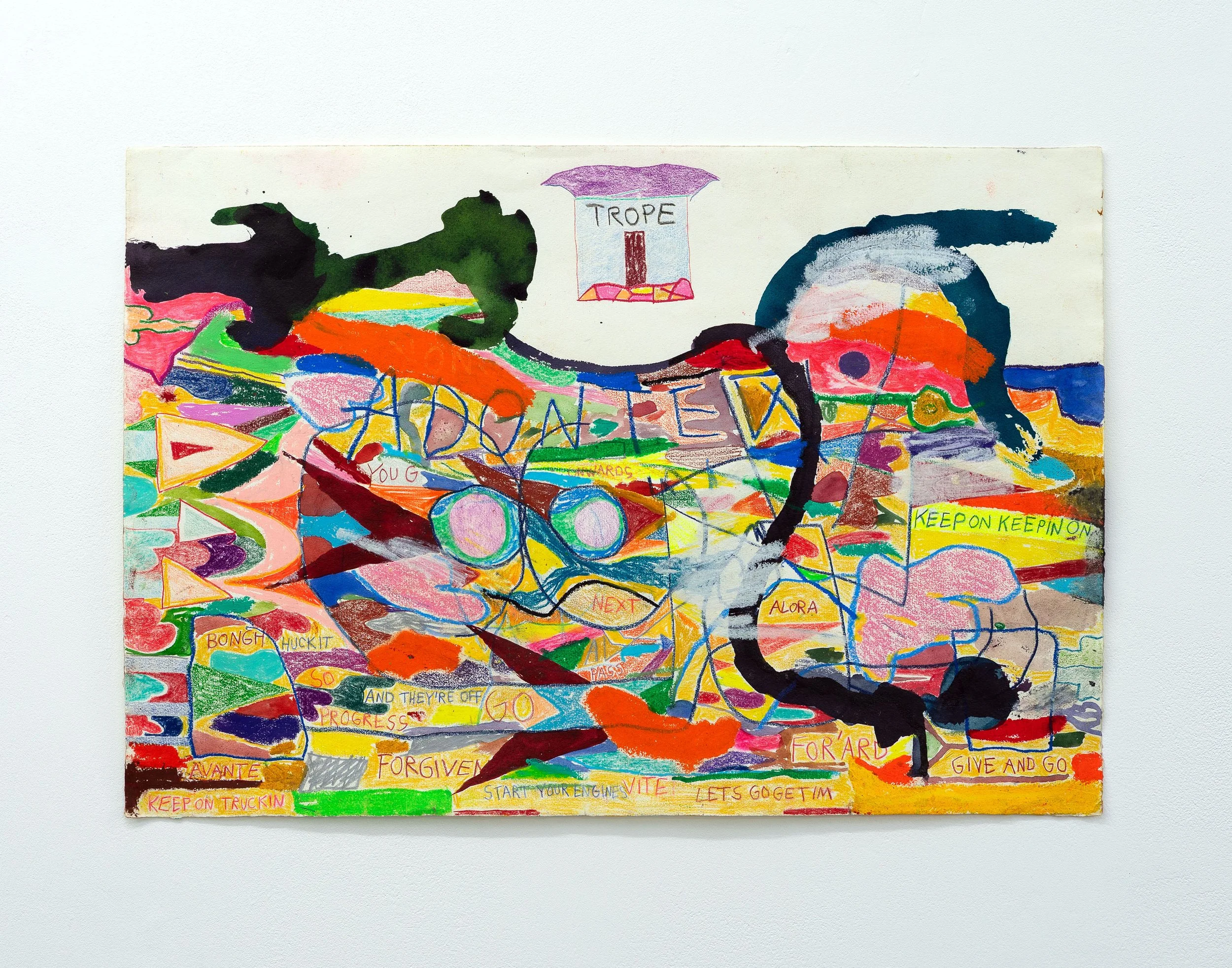 Don’t Settle For Walkin’ brings together a series of unique unframed works on paper produced between 2022 and 2025, a period of sustained, wave-like intensity in Webster’s practice. Working exclusively on paper, these mixed media works invite direct engagement, allowing viewers to experience surface, touch, and scale up close, emphasising intimacy and immediacy. Although modest in size, the works possess remarkable density and presence, extending Webster’s longstanding exploration of how images can exceed their material limits. As Roberta Smith observed of his paintings, they hold “a strange, irrepressible scale”, a quality that reappears here with clarity. Forms emerge through accumulation rather than resolution: fragments of plants, figures, architectural shapes, and symbols hover within shifting fields of marks, resisting fixed interpretation and encouraging immersive looking.