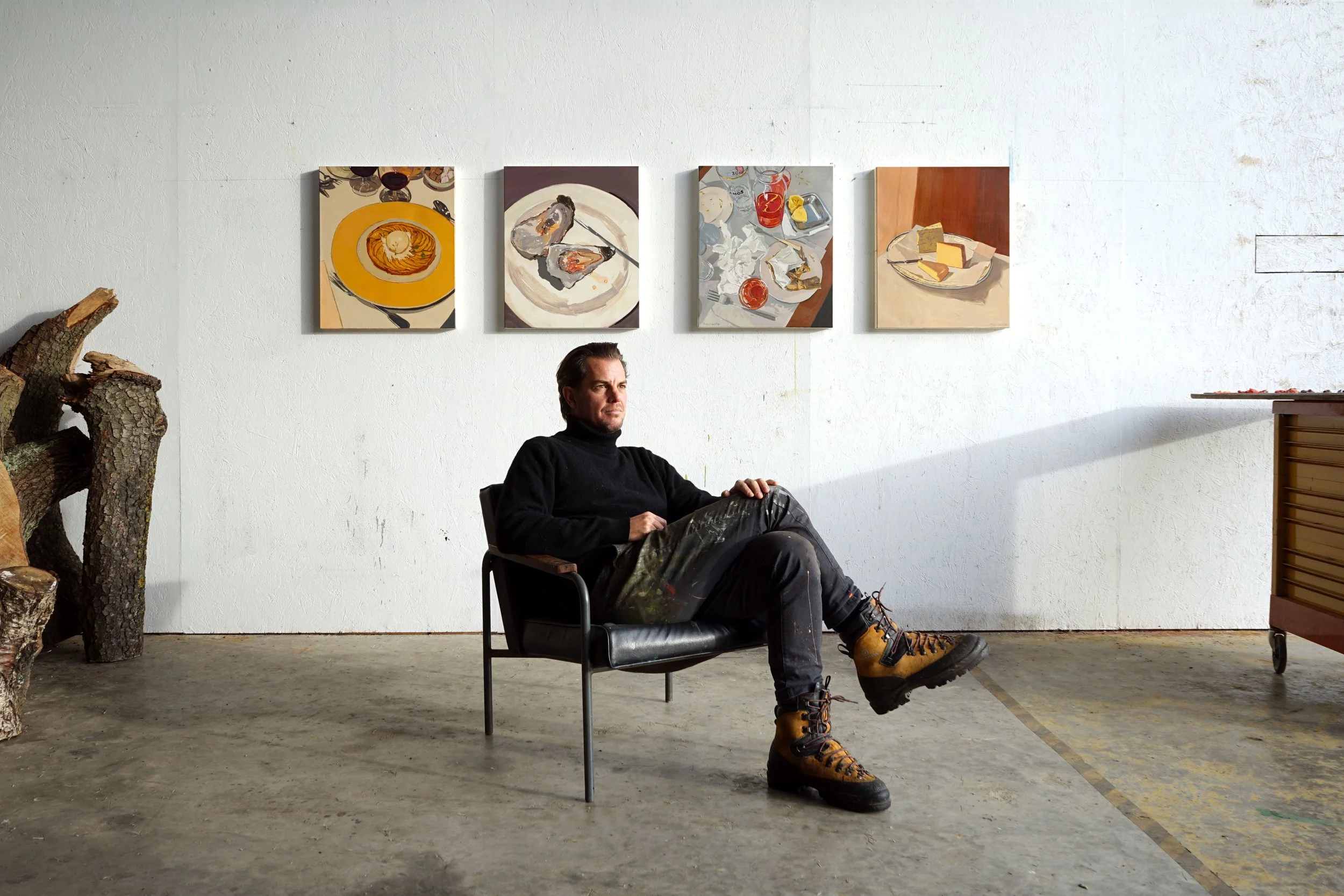 HP: Each course in the exhibition corresponds to a specific memory or shared moment. Could you talk about how you selected these particular dishes - oysters, monkfish, cheese, Tarte Tatin - and what each one revealed to you during the painting process?