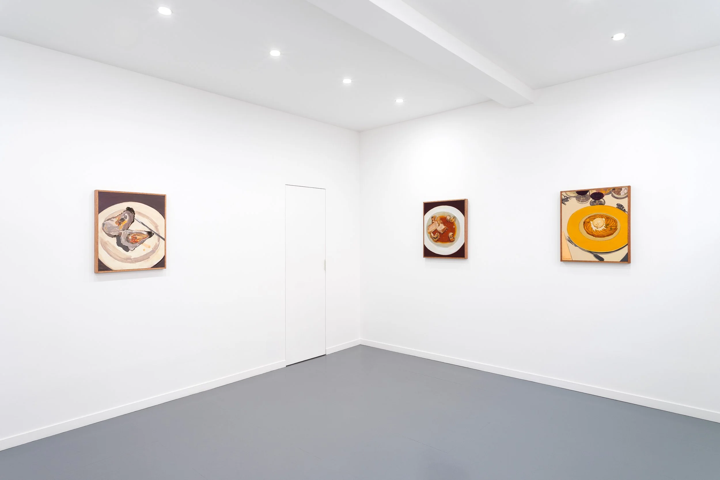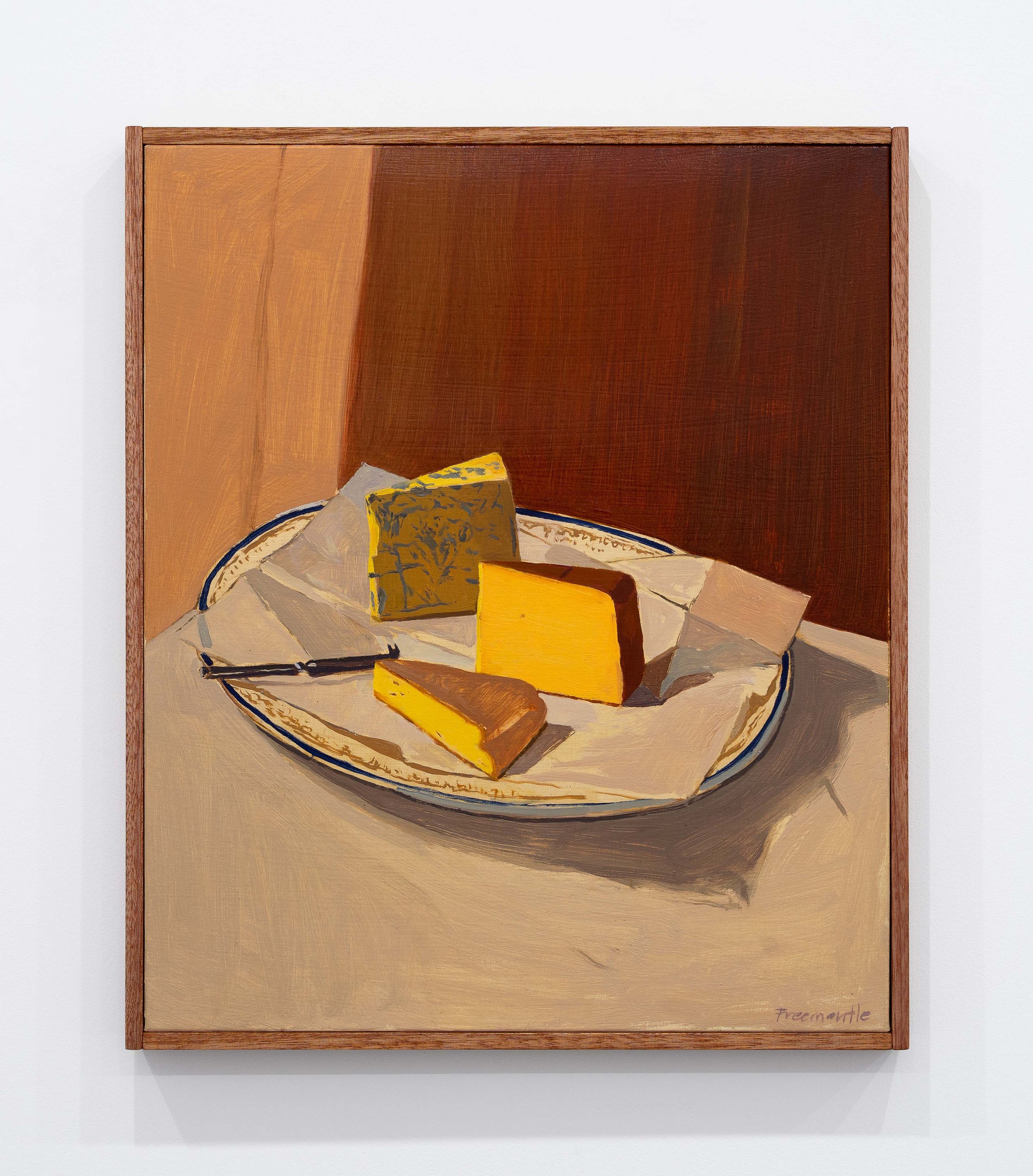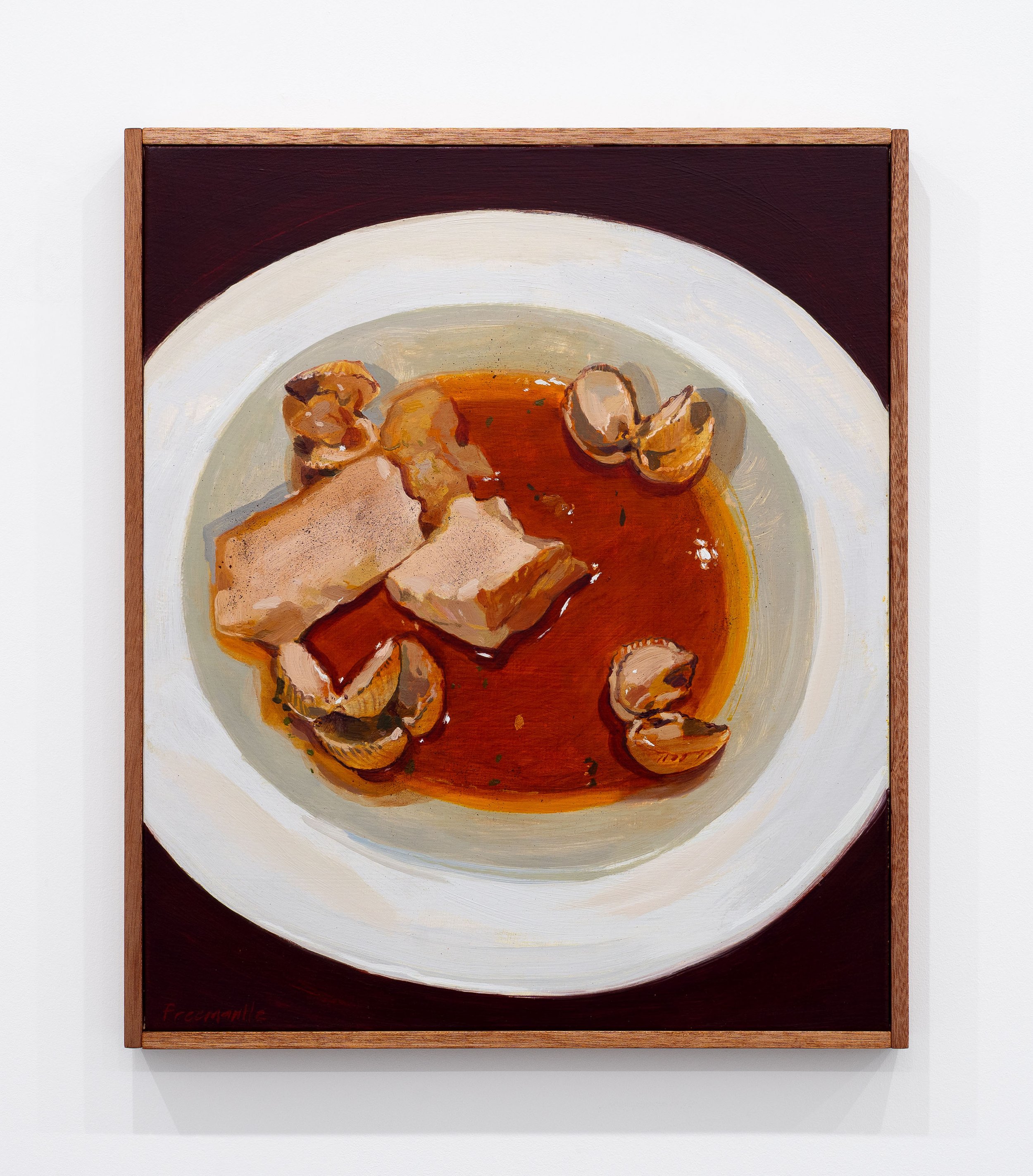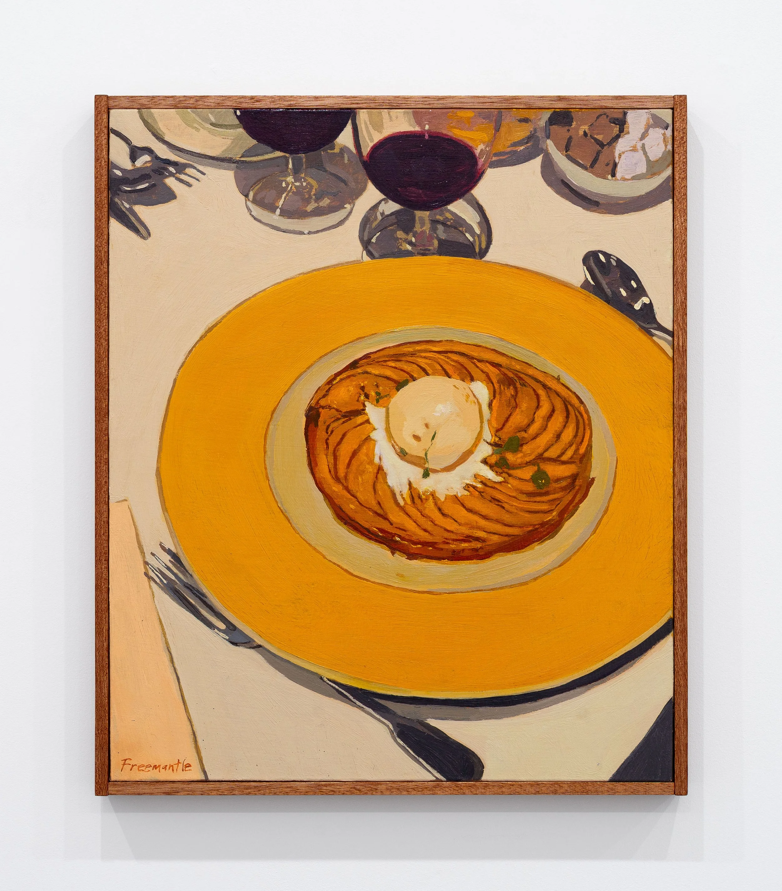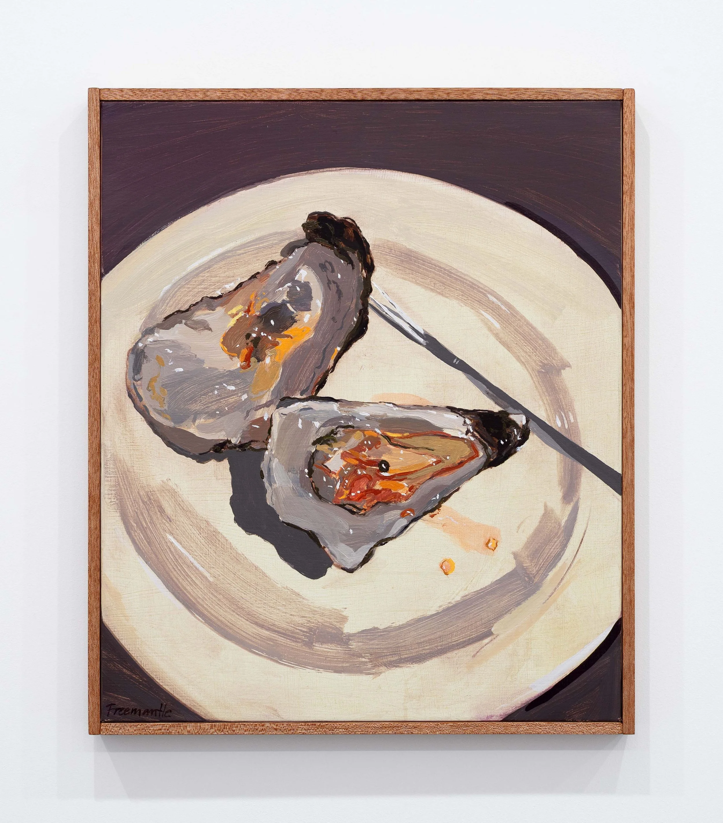 The exhibition unfolds as a symbolic meal: a visual banquet composed of courses that honour moments, tastes, and conversations shared, both real and remembered. Each painting represents a stage in the meal - from oysters and fish, to cheese, dessert, and finally the quiet aftermath - each one a poetic offering that channels Hardaker’s spirit and Freemantle’s enduring affection. The works are grounded in the artist’s own meals and rituals of remembrance: a fish course of monkfish and cockles shared with his wife Anna after Hardaker’s passing; a cheese course inspired by Giorgio Morandi, an artist beloved by both teacher and student; a Tarte Tatin evoking Hardaker’s love for France and his French wife; and an image of the meal’s aftermath, painted from a memory of a joyful family gathering in Athens.