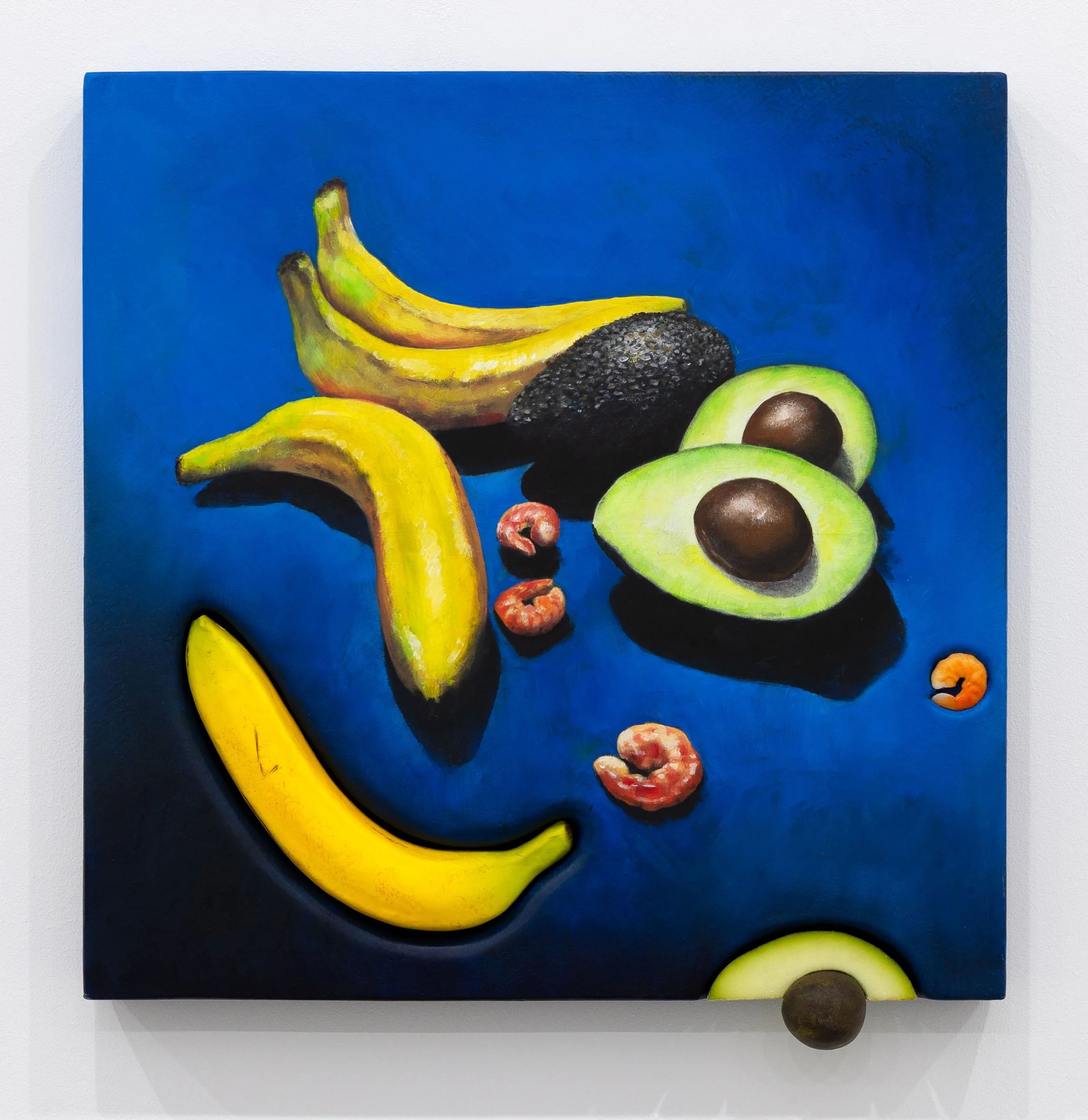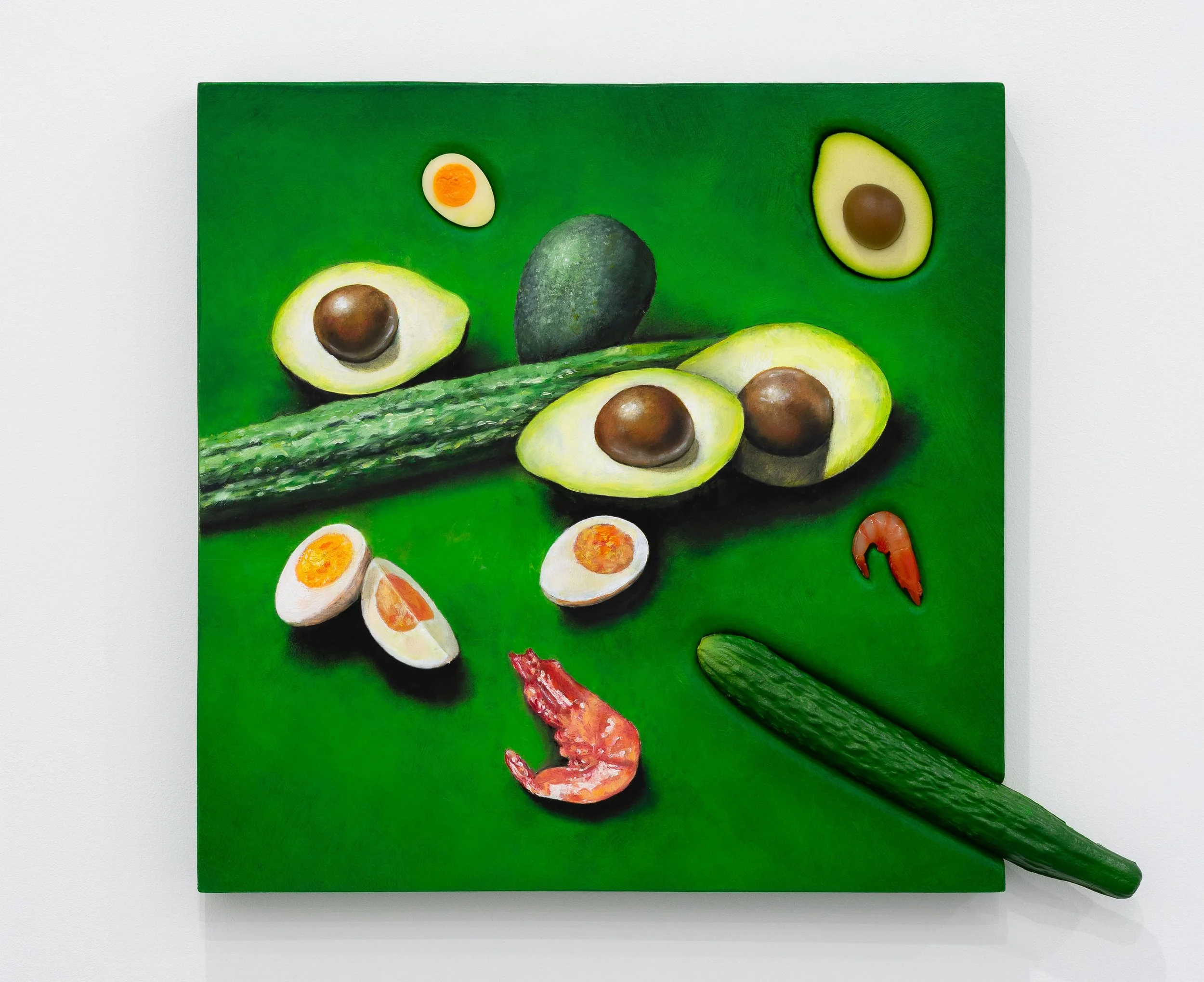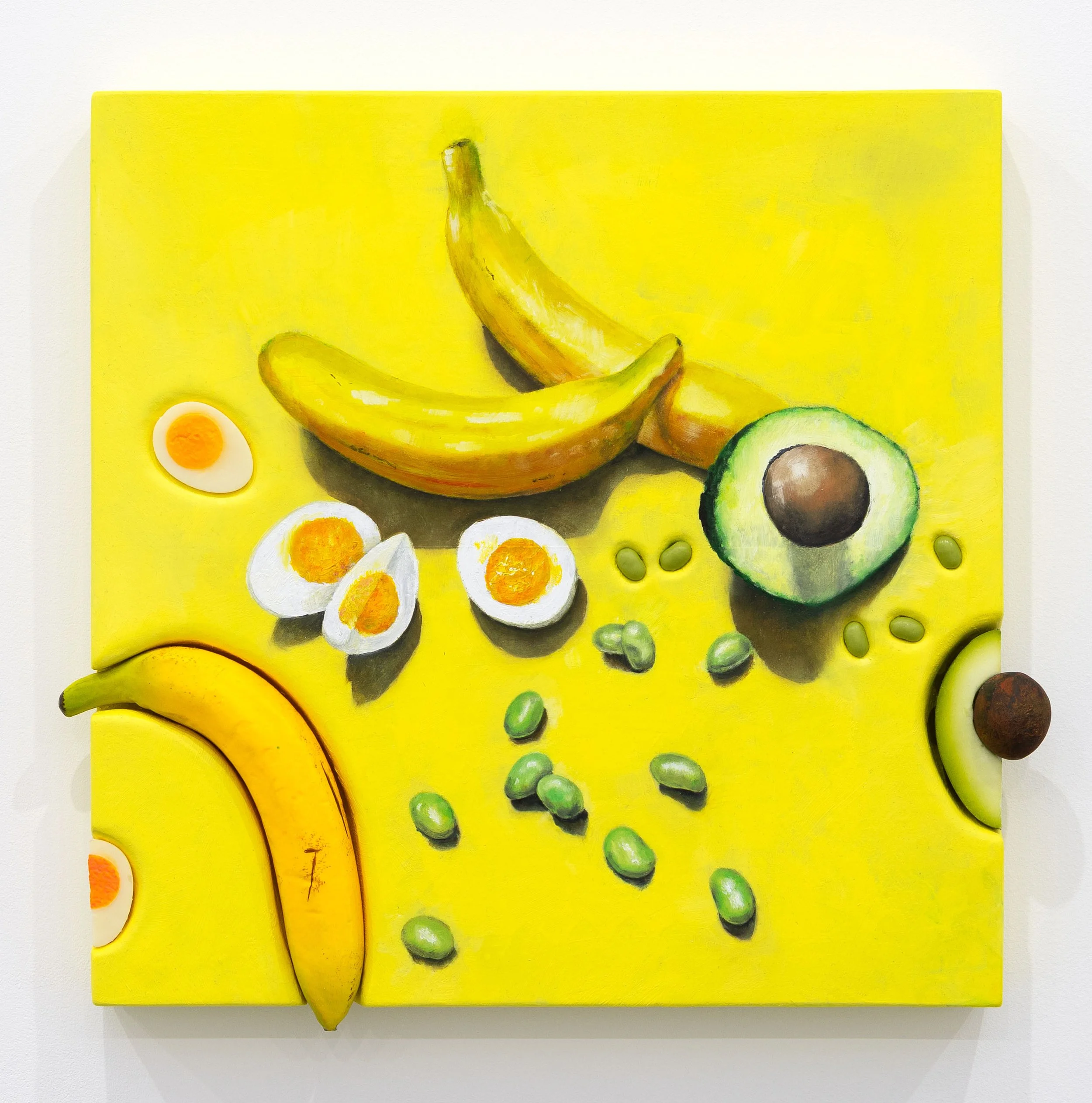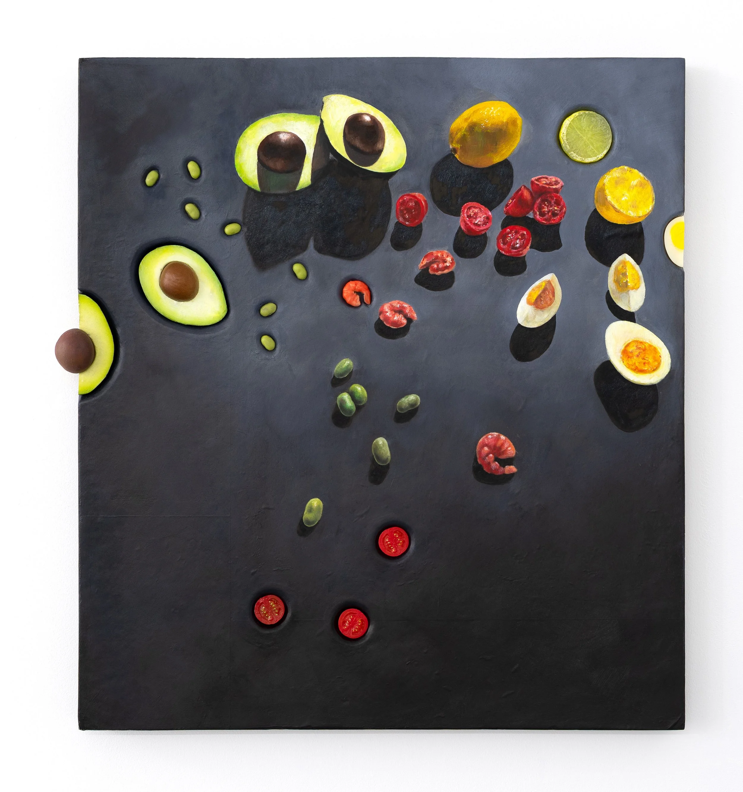 Mark Purves’ latest series, The Treachery of Things, presents a compelling reexamination of the still life genre through a conceptual and material lens. In this new body of work, Purves blurs the line between image and object, illusion and presence. By embedding painted facsimiles of everyday food items into the very surface that represents them, he transforms the canvas into a hybrid form—simultaneously a depiction and a sculptural intervention.